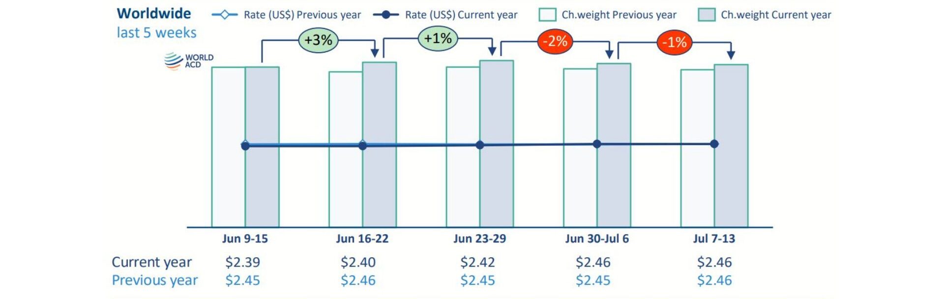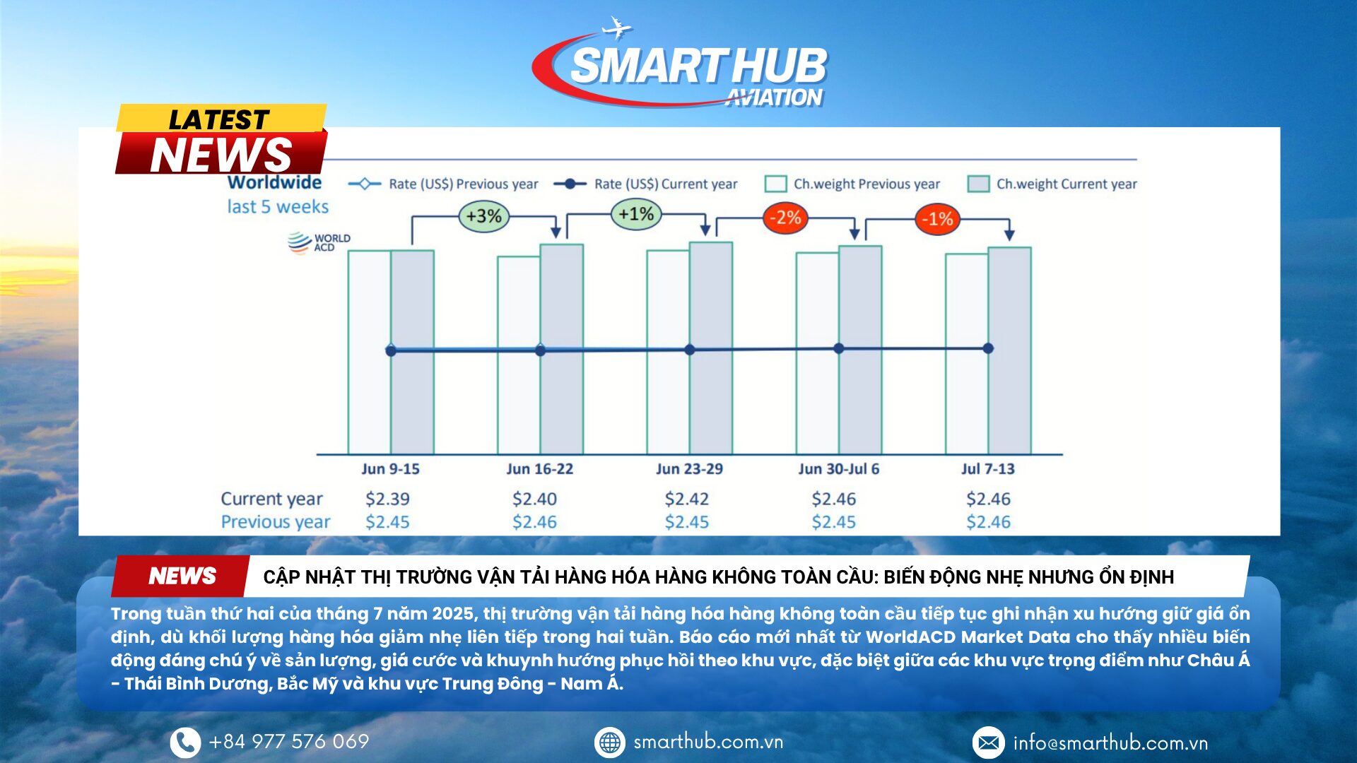 Trong tuần thứ hai của tháng 7 năm 2025, thị trường vận tải hàng hóa hàng không toàn cầu tiếp tục ghi nhận xu hướng giữ giá ổn định, dù khối lượng hàng hóa giảm nhẹ liên tiếp trong hai tuần. Báo cáo mới nhất từ WorldACD Market Data cho thấy nhiều biến động đáng chú ý về sản lượng, giá cước và khuynh hướng phục hồi theo khu vực, đặc biệt giữa các khu vực trọng điểm như Châu Á – Thái Bình Dương, Bắc Mỹ và khu vực Trung Đông – Nam Á.